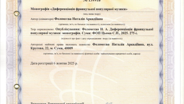 Вітання з отриманням свідоцтва про реєстрацію авторського права на монографію