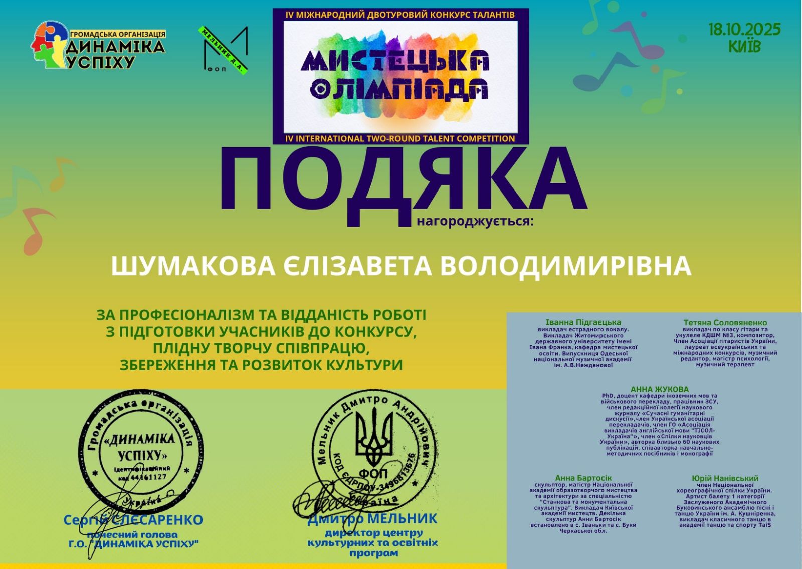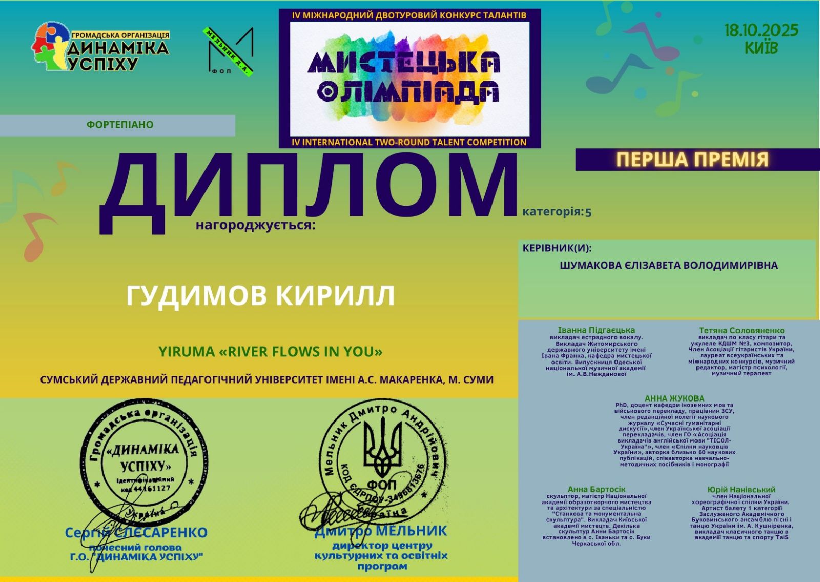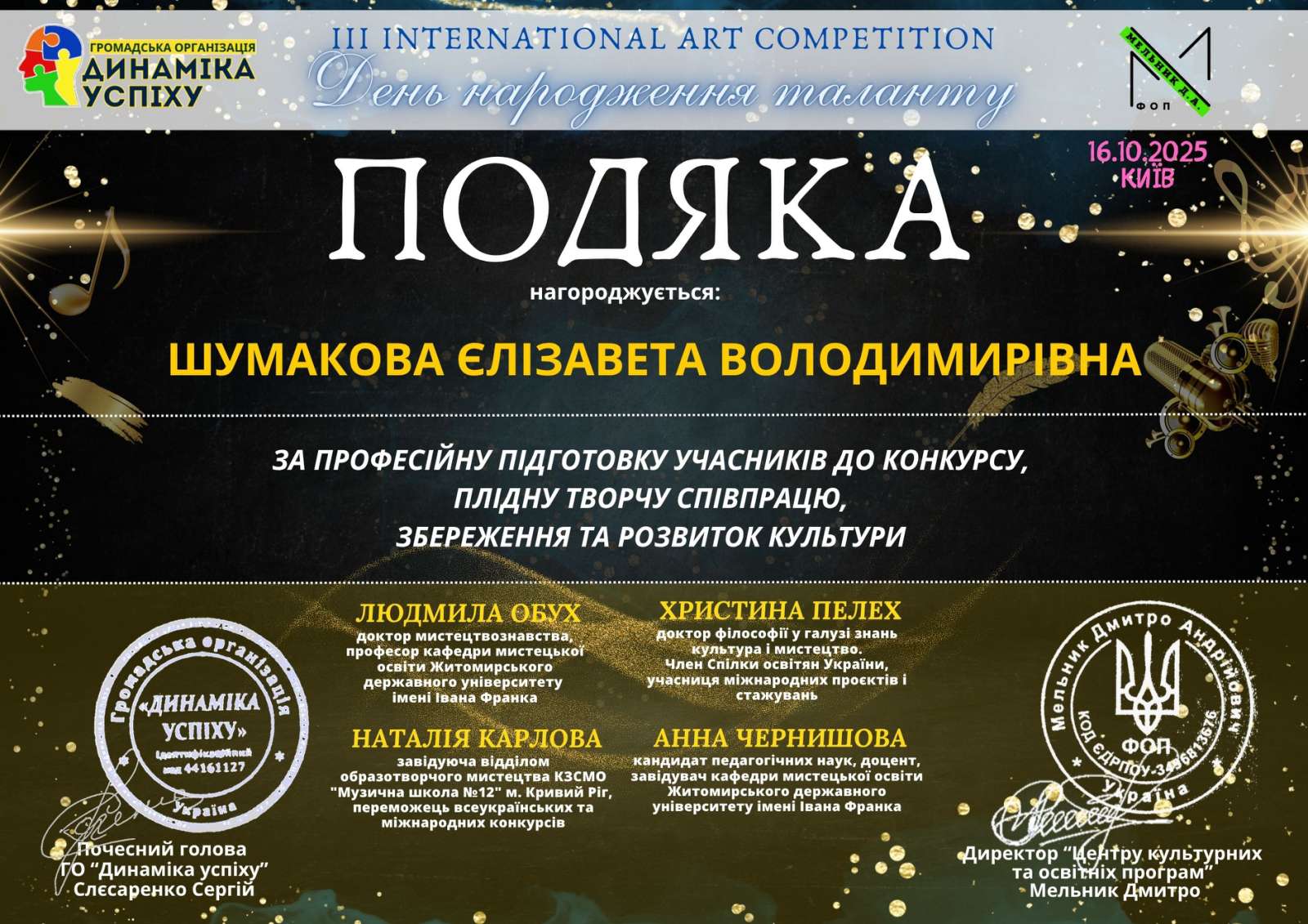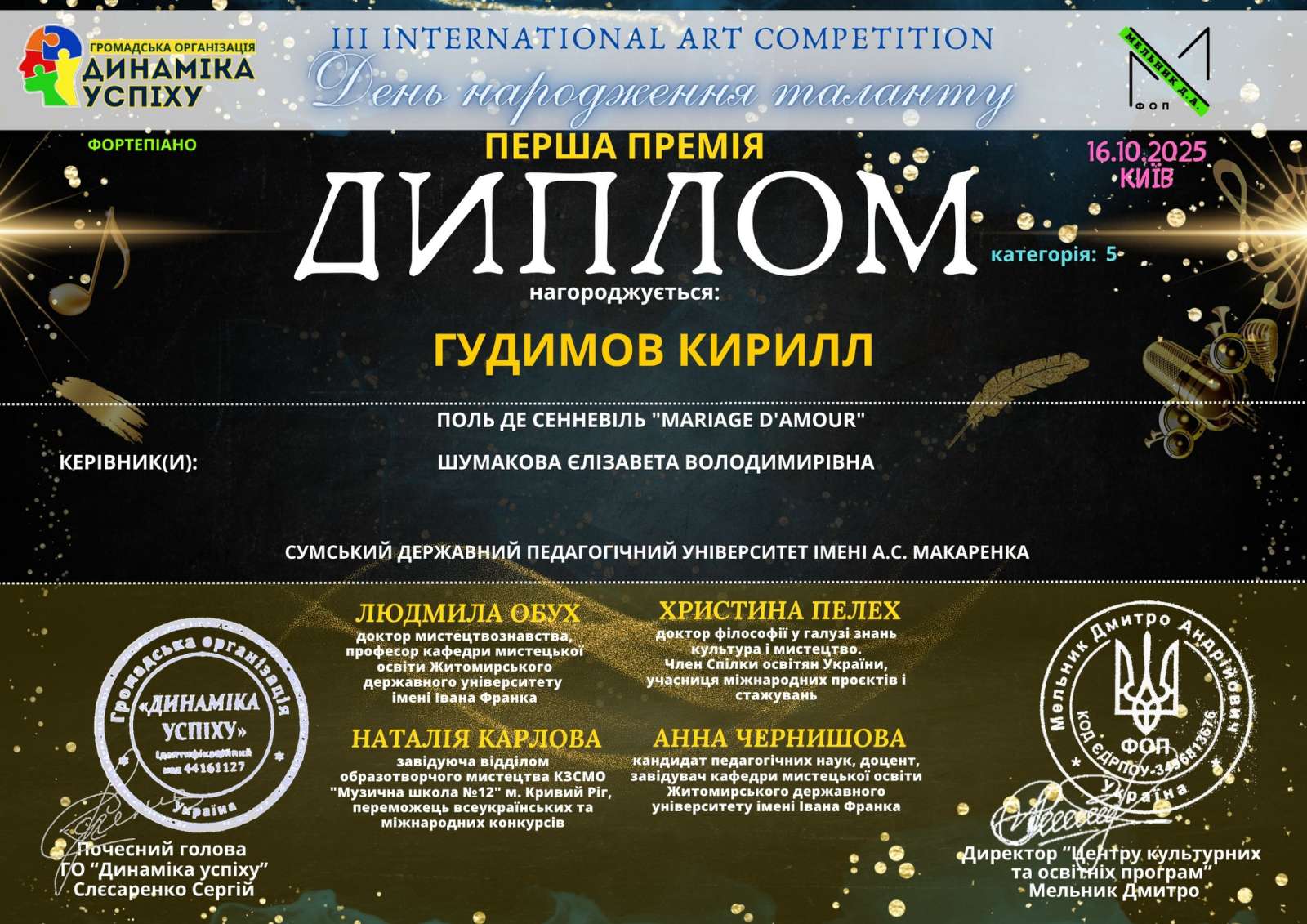 Вітаємо з черговим тріумфом на III Всеукраїнському конкурсі мистецтв «ЗОРІ УКРАЇНИ» (06.10.2025, Київ)!