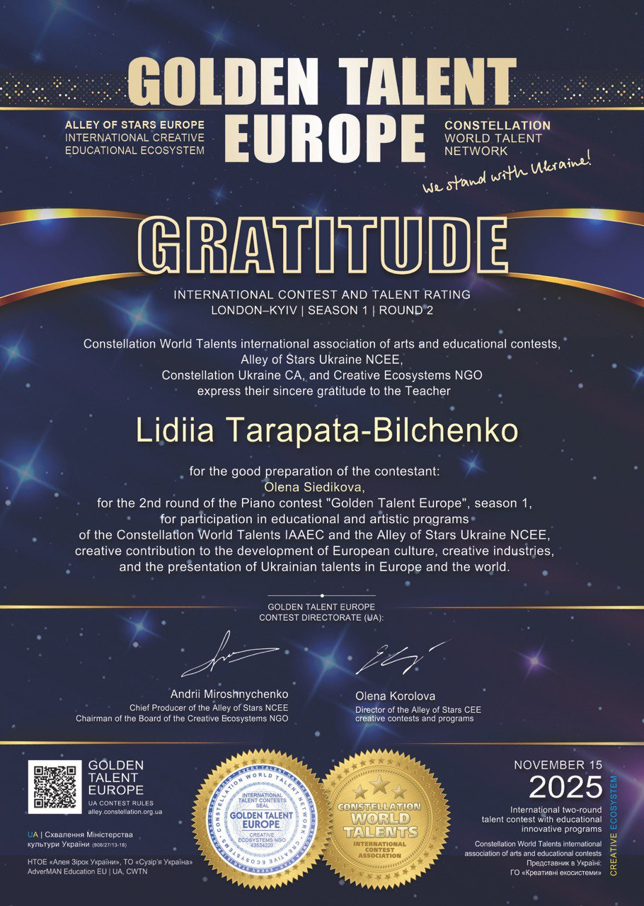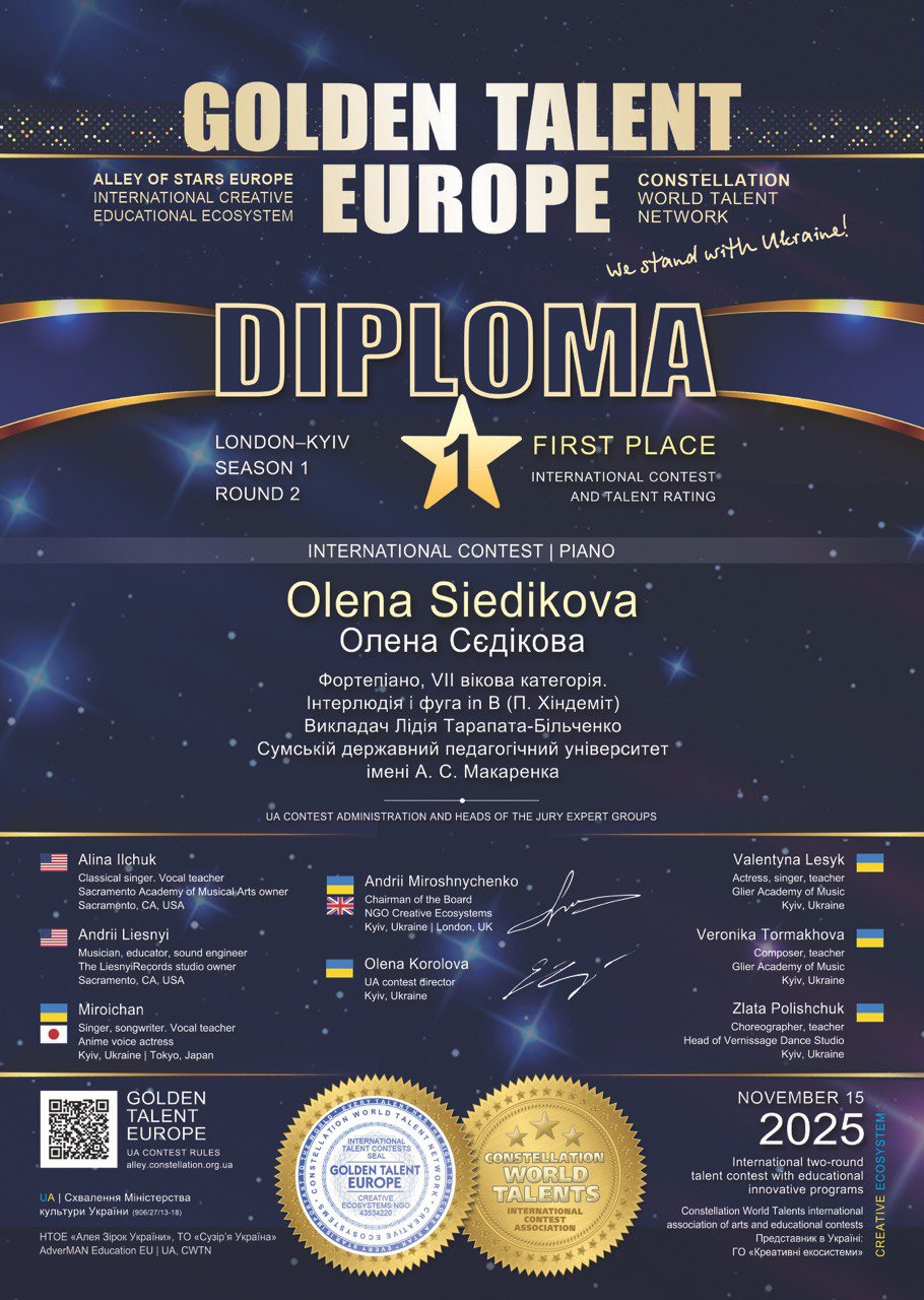 Магістрантка Навчально-наукового інституту культури і мистецтв Олена Сєдікова стала лауреатом міжнародного конкурсу "Golden talent Europe" (London - Kyiv, номінація "фортепіано", клас доцента кафедри музичного мистецтва Лідії Тарапати-Більченко). Конкурс схвалено Міністерством культури України.