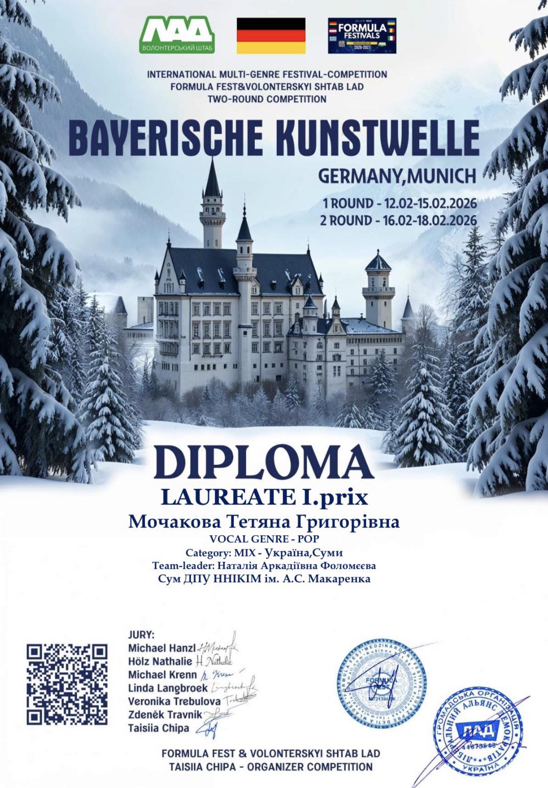 У лютому 2026 року у м. Мюнхен відбувся Міжнародний двотуровий багатожанровий фестиваль-конкурс мистецтв «Bayerische kunstwelle» («Баварська мистецька хвиля»).
