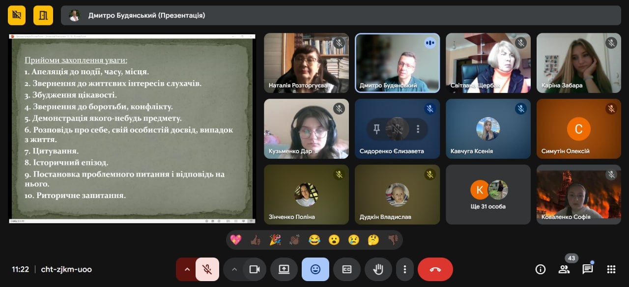 Під час зустрічі говорили про важливість ораторського мистецтва для сучасної людини та про те, як риторичні навички впливають на професійну успішність журналіста, медійника, педагога й будь-якого публічного фахівця. Було розглянуто конкретні прийоми ефективного мовлення, техніки переконливого публічного виступу та методи роботи з голосом і увагою аудиторії.