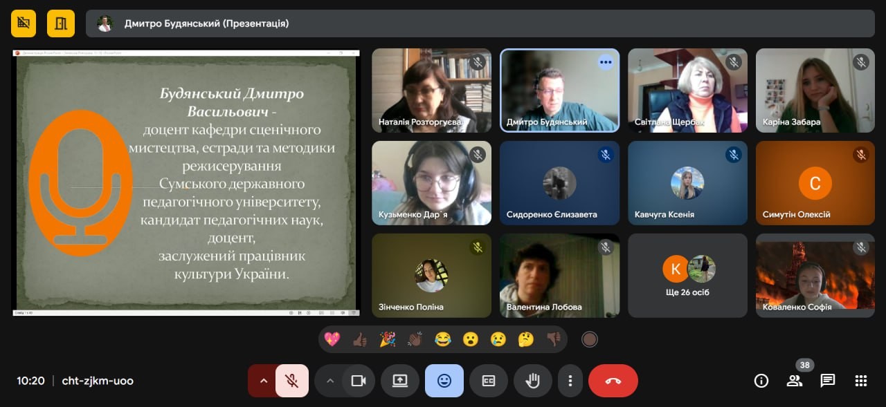 Спікером заходу виступив доцент кафедри сценічного мистецтва, естради та методики режисерування ІКМ СПУ Дмитро Будянський.