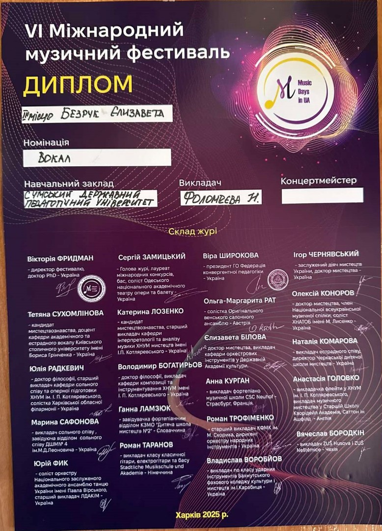 15-16 листопада 2025 року у місті Харків відбувся VI Міжнародний музичний фестиваль «Music Days in UA».