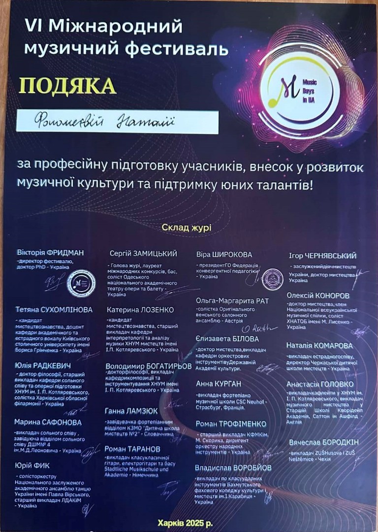 Наталія Фоломєєва нагороджена подякою від організаційного комітету фестивалю за професійну підготовку учасників, внесок у розвиток музичної культури та підтримку юних талантів.