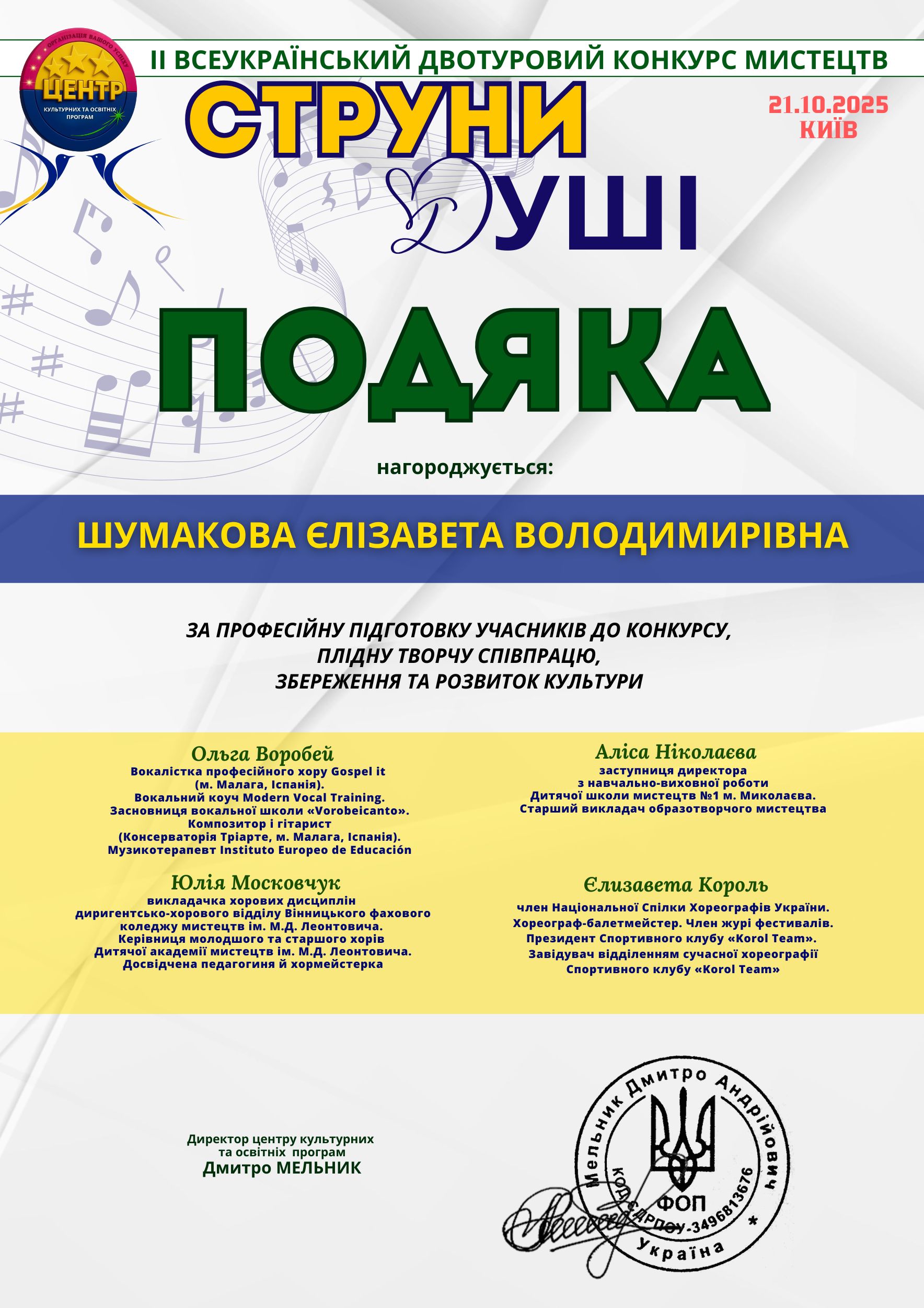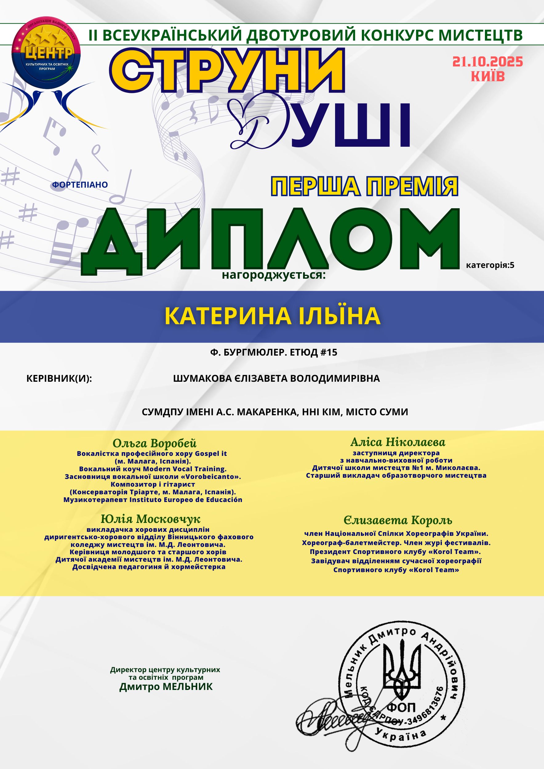 Студентка ННІ КІМ СумДПУ імені А.С. Макаренка Катерина Ільїна здобула Диплом І премії на II Всеукраїнському конкурсі мистецтв "Струни душі" (м. Київ, 21.10.2025).