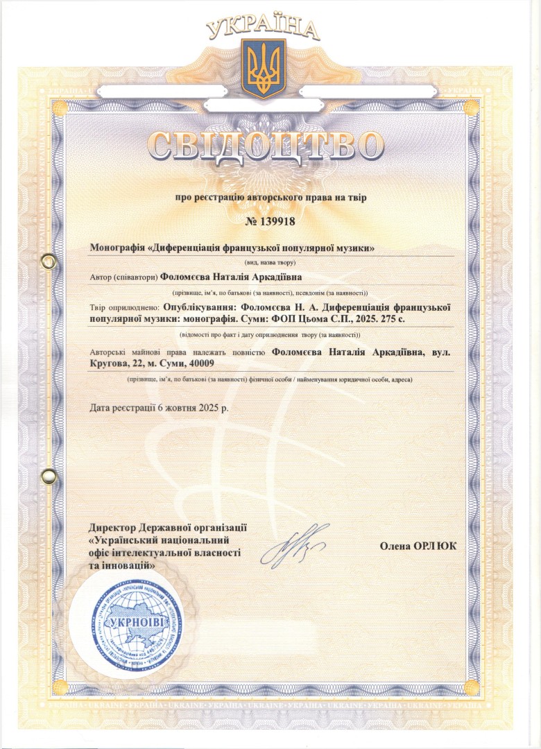 Вітаємо кандидата педагогічних наук, доцента, PhD, доцента кафедри сценічного мистецтва, естради та методики режисерування Наталію Фоломєєву з отриманням свідоцтва про реєстрацію авторського права на монографію «Диференціація французької популярної музики».